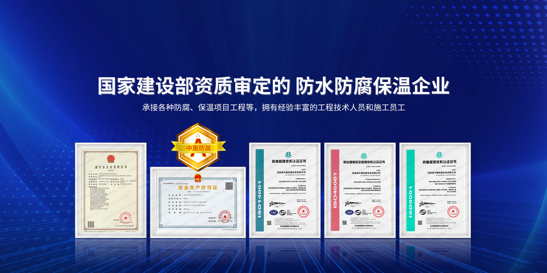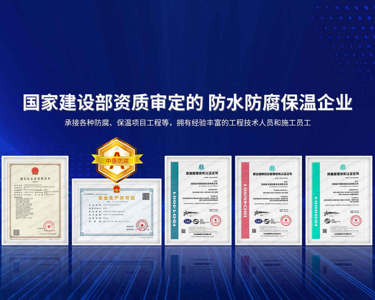 公司經營范圍:防水防腐保溫工程;消防設施工程;建筑裝修裝飾工程;建筑機電安裝工程;電力工程;建筑工程;石油化工工程;工業清洗工程;油罐清洗工程;鋼結構工程;環保工程;模板腳手架工程;電纜防火封堵、防污閃噴涂、外墻外保溫工程;各類施工勞務作業;設備維修、船舶鉚焊、涂裝;電力工程材料、建材、防水材料、防火材料、防腐保溫材料銷售,并相繼通過了GB/T19001-2008idtISO9001:2008GB/T50430-2007質量管理體系認證證書。GB/T24001-2004idtISO14001:2004環境管理體系認證證書。GB/T28001-2011idtOHSAS18001:2007職業健康安全管理體系認證證書。公司是中國防腐蝕于防護協會、中國施工企業管理協會、電力協會和中國鋼結構防水協會會員單位。 公司的經營業務涵蓋了石油、化工、電力、冶金、煤炭、船舶、國防、燃氣、水利、環保、交通運輸、航空及國防軍工和輕紡市政等行業的防腐保溫絕熱設備。鋼結構安裝、防火、防水、金屬噴鍍、聚脲噴繪、陰極保護、防滲透堵漏、玻璃鋼及各種磚版材料襯里、橡膠襯里、煙氣硫和耐酸溶劑腐蝕等工程施工。公司連續十年榮獲“省市先進施工企業”“安全生產先進單位”“重合同,守信用企業”和“AA***資質企業”的稱號。2000年被命名為市級文明單位,2002年被國家工商行政管理局命名為“重合同,守信用的企業”、被中國工業防腐蝕技術協會命名為“防腐蝕企業,能源節約及環境保護領域有豐富的經驗和***的業績。工程一次交驗合格率100%。其中攀枝花鋼鐵公司煉鐵廠四號高爐及熱風爐防腐工程、上海寶鋼公司煤氣柜防腐工程、撫順石油一廠裝置防腐項目、齊魯石化公司稀烴廠高塔防腐工程、吉林化學工業公司煉油廠油罐防腐工程、天津石化熱電廠六號爐頂棚聯絡管保溫工程、大慶油田(太倉)力神泵業工程、中國化學工程第十一建設工程、中原油田勘探局工程、中國石化銷售有限公司華北分部、魯皖輸油管道工程、貴州開磷息烽合成氨工程、陜西黃陵煤化工程、中國石油天然氣西部管道塔里木輸油工程、邯鋼集團邯寶鋼鐵公司煉鐵工程、德州供電工程、吉寶(南通)船廠工程,偃師華潤熱力工程、鄭州熱力總公司。 河南省中惠防腐安裝有限公司愿以豐富的施工經驗,***的技術,***的設備,***的管理,***的服務,竭誠為國內外廣大的用戶提供***滿意、******的工程作品。 我公司愿與國內外同仁一道,團結協作,共同推進防腐蝕行業發展! 公司地址:河南省長垣縣建設路北段360號 固定電話:0373-8866488 郵編:453400 網址:http://www_zhff_com_cn.hifre.com